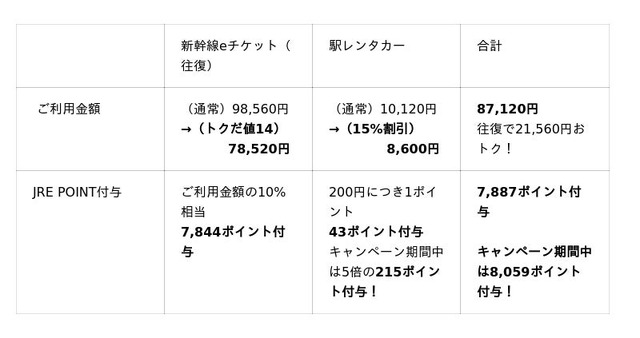 本プランは、東日本旅客鉄道株式会社(JR東日本)が提供する「えきねっと」の「JRきっぷ」チケットレス商品(指定席)をご予約のうえ、駅レンタカーを「えきねっと+駅レンタカープラン neo」のプランでお申し込みいただくと、チケットレス商品の10%(最大18%)相当のJRE POINTが付与され、さらにレンタカー料金も通常価格の15%割引となる大変おトクなプランです。【JRE POINT付与例】