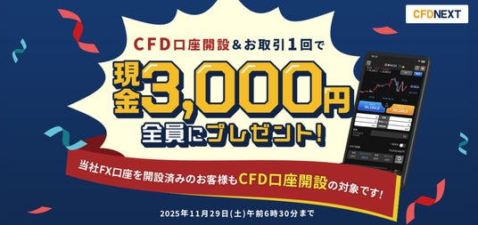 株式会社外為どっとコム(本社:東京都港区、代表取締役社長:竹内 淳)は、『CFDネクスト』におきまして、2025年11月3日(月)より「口座開設&お取引1回でもれなく現金3,000円をプレゼント!キャンペーン」を実施します。