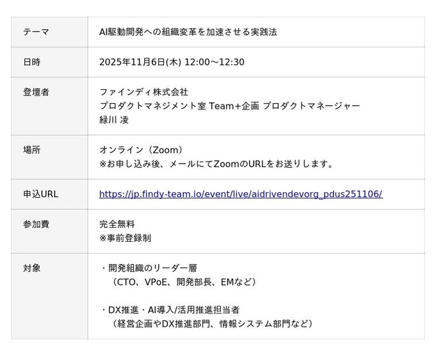 新機能のリリースにあわせて、オンラインセミナー「AI駆動開発への組織変革を加速させる実践法」 を、11月6日(木)12:00~12:30に開催いたします。本セミナーでは、AI活用の成果を「数値」で可視化し、AI駆動開発に向けた組織変革を加速させる実践手法をご紹介します。
