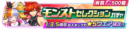 それぞれ★5ウェアが『モンスターストライク』(以下、『モンスト』)の2キャラクターのみ、『白猫プロジェクト NEW WORLD'S』(以下、『白猫』)の2キャラクターのみが登場するガチャの第2弾が開催予定です。本ガチャは有償ジュエル500個限定で5回までまわすことができ、1回目、3回目、5回目のスタンプでは★5ウェアが確定となります。『モンスト』からはジャック・ザ・リッパー(CV:高橋李依)、エクスカリバー(CV:小西克幸)の2人が、『白猫』からはシャルロット(CV:内田真礼)、ノア(CV:水瀬いのり)の2人が登場します。それぞれのキャラクターは限定ウェアも登場します。