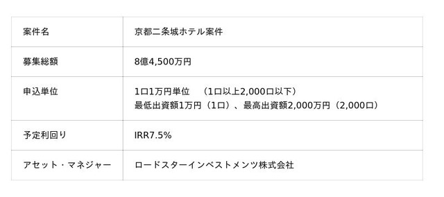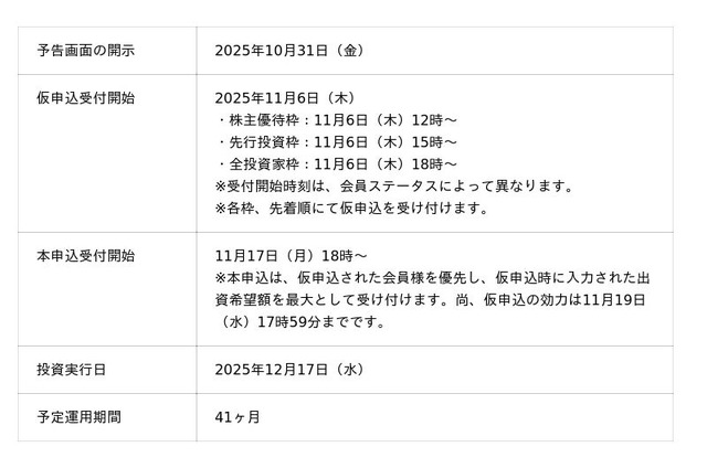 本投資案件は、当社の子会社であるロードスターインベストメンツ株式会社が匿名組合出資の募集及び運用業務を行います。また、当社も共同出資(セイムボート出資)を行います。これにより、当社グループとして投資家の皆様と共通のゴールを持ち、一体感の高い投資プロジェクトを目指します。