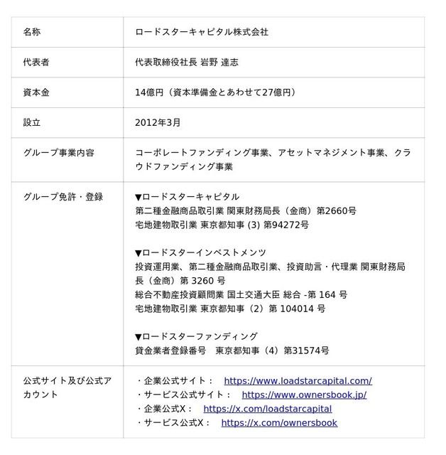 「不動産とテクノロジーの融合が未来のマーケットを切り開く」というミッションを掲げるロードスターキャピタル株式会社(本社:東京都中央区、代表取締役社長:岩野達志、東証プライム市場・3482)は、グループで運営する不動産クラウドファンディングサービス『OwnersBook(オーナーズブック)』において、第3号となるエクイティ型案件(以下「本投資案件」)の募集を行う運びとなり、本日付で本投資案件の有価証券届出書を提出いたしましたのでお知らせいたします。