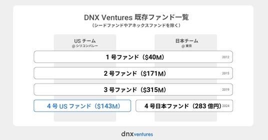 米国シリコンバレーと東京に拠点をおくベンチャーキャピタルDNX Ventures(在米国サン・マテオ / マネージングパートナー: 北村充崇、前田浩伸、Q Motiwala、以下DNX)は、当社を無限責任組合員とする「4号USファンド」の組成を143百万米ドル(約217億円)にて完了いたしました。米国シリコンバレーのUSチームが運営する本ファンドは、日本国内の事業会社16社を中心にご出資いただいて組成し、米国をはじめとする海外のB2Bスタートアップへ投資を行うファンドです。