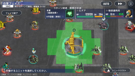 マス目上のマップでユニットを動かして戦う「ジージェネレーション」シリーズのプレイスタイルを踏襲しつつ、スマホで手軽に遊べるオートモードも本作では搭載!