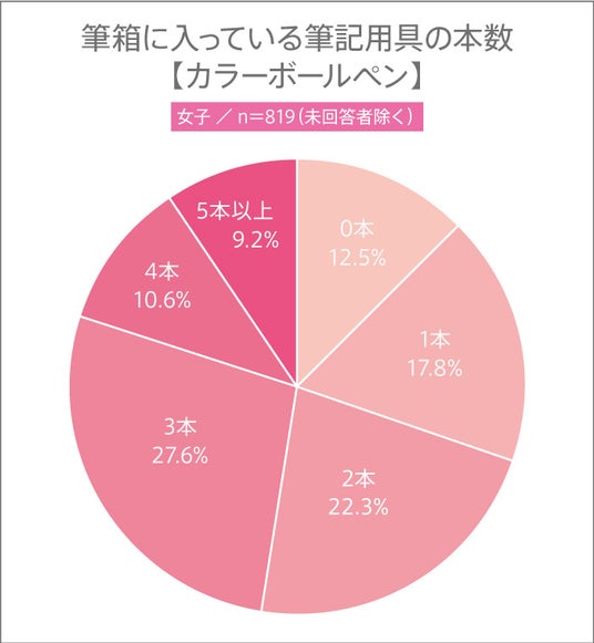 “0本”と回答したのは、男子は17.4%、女子は12.5%で、男子よりも女子の方が、筆箱の中にカラーボールペンが入っていることがわかりました。
