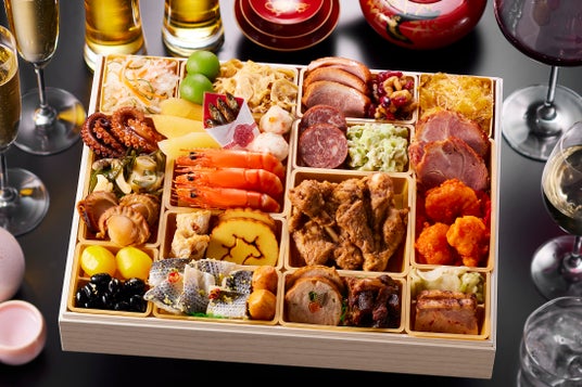 紅白なます/若桃甘露煮/湯葉の柚香煮/合鴨ロース/クランベリーくるみ/ふかひれ風中華くらげ/たこの旨煮/味付数の子/田作り/人参と大葉のカニ団子/牛タンパストラミ/数の子と枝豆のサラダ/国産黒糖焼き豚/北海つぶわさび/有頭海老の艶煮/手羽元黒胡椒焼き/海老のチリソース煮/照焼帆立/小鯛西京焼/伊達巻/栗甘露煮