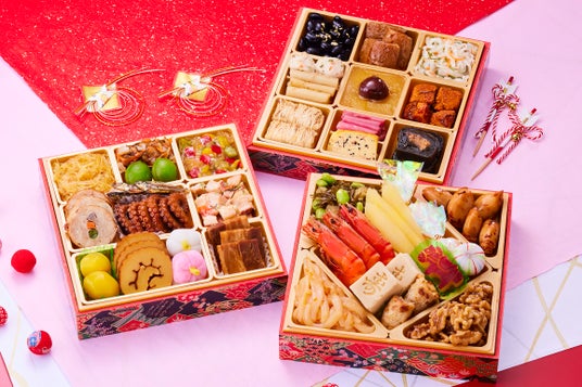 紅白なます/伊達巻/にしん昆布巻/国産豚肉ごぼう巻/人参と大葉のカニ団子/渋皮栗甘露煮/きんとん/チキン三昧/子持昆布山海和え/有頭海老の艶煮/味付子持イカ/照焼帆立/小鯛西京焼/寿高野豆腐/田作り/オーロラカスタード/味付数の子/しそ風味の姫れんこん/やわらか福さ焼き/黒豆/きんかん/イカの柚子味噌和え/若桃甘露煮/花餅紅梅/たこの旨煮/鱈の旨煮