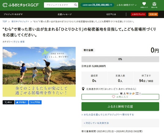 村に暮らすこどもたちが安心して“信頼できるおとな”と過ごすことができる場、「子ども第三の居場所」づくりを目指すため、国内最大級のふるさと納税総合サイト「ふるさとチョイス」にて、クラウドファンディング型ふるさと納税「ガバメントクラウドファンディング(R)」(以下「GCF(R)」)に取り組みます。