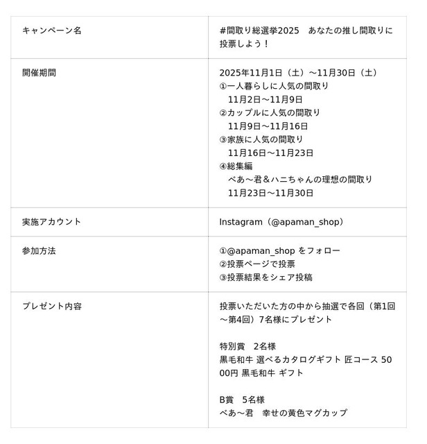 賃貸住宅仲介業店舗数No.1*のAPAMAN株式会社(東京都中央区、EL CAMINO REAL株式会社〈東京都千代田区〉の連結子会社、代表取締役社長:山崎 戒)は、公式Instagram(@apaman_shop)にて、フォロワー参加型キャンペーン「#間取り総選挙2025|あなたの推し間取りに投票しよう!」を2025年11月2日(日)より開催いたします。