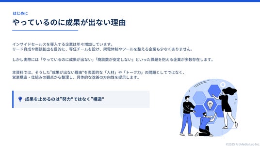 株式会社プロメディアラボ(本社:東京都中央区、代表取締役:廣瀬義憲)は、インサイドセールスの成果停滞に悩む企業のための最新資料『なぜ成果が出ない?インサイドセールスの停滞を招く原因と解決策』 を公開しました。