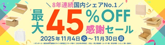 2025年11月4日(火)~2025年11月30日(日)の期間、No.1を記念してこれまでのご愛顧の感謝を込めて「8年連続国内シェアNo.1感謝セール」を開催いたします。開催期間中は人気の定番商品を中心にダンボール・梱包材を最大45%OFFで販売いたします。