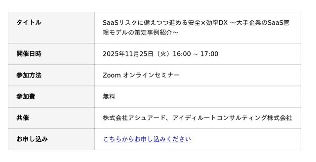 本セミナーでは、DXとサイバーセキュリティ領域で高い専門性を持つアイディルートコンサルティングと、10,000件以上のクラウドサービスセキュリティ評価実績を持つアシュアードが、大手企業が直面するこのSaaSガバナンスの課題解決法について、具体的な事例を交えながら解説いたします。