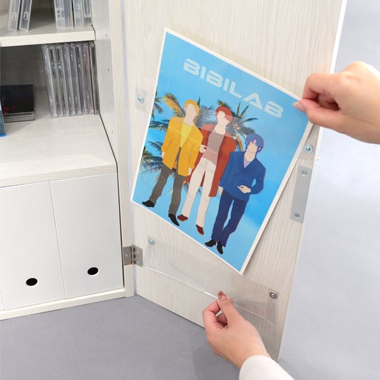 公式のジャンボうちわがそのまま差し込める『うちわ額』がついた「オープン扉棚」には、市販のA4ファイルケース×4個がシンデレラフィット。収納に困りがちなうちわ・雑誌を整理しながら保管できます。