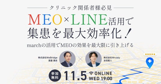 LINEを活用した集患と継続収益まで自動化するオールインワン医療DX「march」を展開する株式会社Wrusty(本社:東京都渋谷区、代表取締役:上田遼)と、デジタルマーケティング事業、MEOサポートなどを展開する株式会社WeBridge(本社:東京都新宿区、代表取締役:白井俊久)が、全国の医療機関を対象に、無料オンラインセミナー「MEO×LINE活用で集患を最大効率化!~marchの活用でMEOの効果を最大限に引き上げる~」を2025年11月5日に開催いたします。本セミナーでは、クリニック・医療機関の集患に欠かせないGoogleビジネスプロフィールを活用した最新のMEO(Map Engine Optimization)対策について、近年のアルゴリズム傾向や成功事例も交えながら、初心者にもわかりやすく解説しながら、marchの活用をすることで、MEO対策を効率的に進められるだけでなく、LINEを活用することで、来院や再来院に繋げる施策についてもわかりやすく解説いたします。