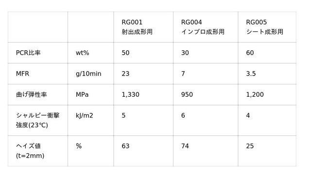 社内基準にて剛性・耐衝撃性等の主要物性項目がバージン品と同水準であり、また、安定した成形加工特性を実現しました。