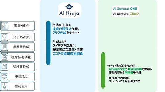 「AI Ninja」は、「AI Samurai ZERO/ONE」の互いの強みを活かした統一ブランドとして、パッケージ構成を基本とした提供を行っていきます。「AI Ninja」は“調査・解析から発明提案まで”を中心に、「AI Samurai」は“権利化(明細書作成および中間対応)から特許庁提出書類作成まで”を中心に機能融合していきます。