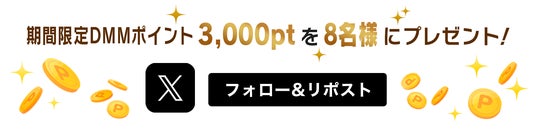 - キャンペーン内容:「DMMスクラッチ」公式Xアカウントをフォロー&リポストされた方の中から抽せんで8名様に、DMMポイント「3,000pt」が当たるキャンペーンを実施いたします。