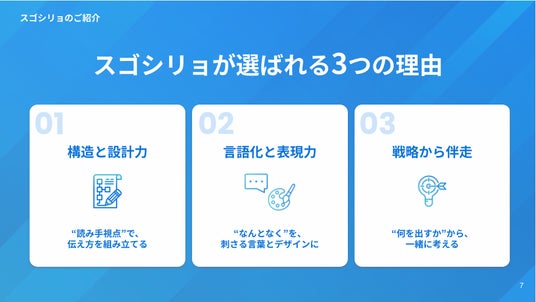 スゴシリョは、企業の資料制作を上流の企画・設計からデザインまでワンストップで支援することで、「読み手を動かす」資料を制作・提供しています。