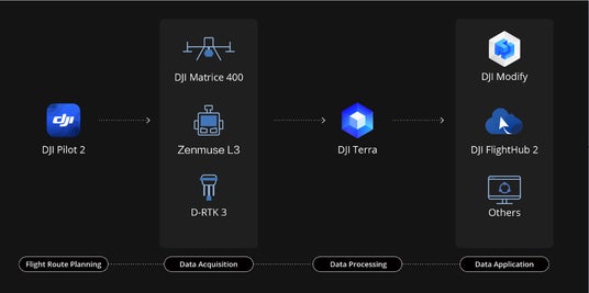 DJIエコシステムとの完全な統合により、Zenmuse L3は、データ取得から処理、活用までの一貫したワークフローを提供します。D-RTK 3多機能ステーションやDJI Terra、DJI Modifyなどと連携し、ユーザーにとって使いやすい操作性を提供します。これにより、複雑なマッピング作業も効率的に完了することができます。