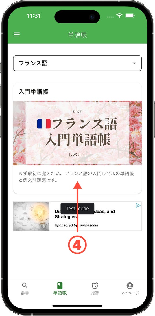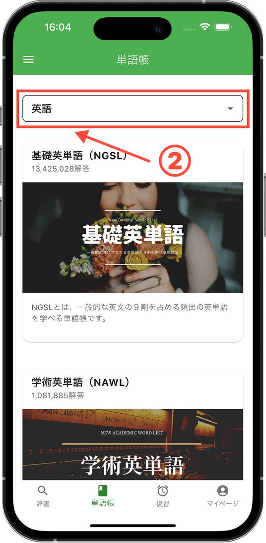 1, アプリにログインいただき、タブバーの「単語帳」をタップしてください。