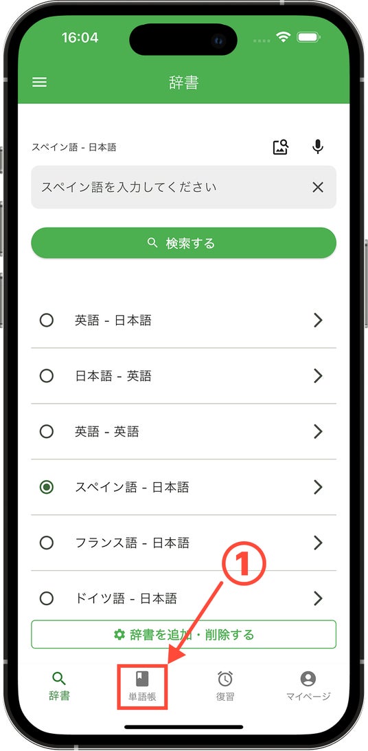 タブバーの「単語帳」をタップしてください。