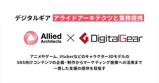 デジタルギア株式会社(本社:東京都港区、代表取締役社長:漆崎祥一)は、アライドアーキテクツ株式会社(本社:東京都渋谷区、取締役社長:村岡弥真人、証券コード:6081)と業務連携パートナーシップ契約を締結しました。本提携により、2D/3Dアニメーションを活用したSNS向けコンテンツの企画・制作から、マーケティング施策への活用までワンストップで支援する体制を構築し、IP/エンタメ業界や企業・自治体のマーケティング活動をサポートしていきます。