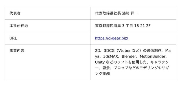 お客様を起点に"ギア"を回すことで、感動とワクワクに貢献します。デジタルギア株式会社は、2023 年に設立されたデジタルエンターテイメント制作会社です。アニメやゲーム、Vtuber などのキャラクターや背景の 3D モデル制作をはじめ、イラストや 2DCG アニメーションの制作も手がけています。「Drive your Digital」を掲げ、クライアントのニーズに応じた最適なクリエイティブを提供することを使命としています。3D キャラクターのモデリングやモーション収録、イラスト制作、Live2D、Spine を用いたアニメーションなどをワンストップで対応可能な体制を強みとしています。エンジニア、ディレクター、デザイナーが連携し、企画から制作まで一貫したサービスを提供しています。今後は、Vtuber のタレントマネジメントや広告代理事業にも展開し、業界をリードするマルチクリエイター企業を目指します。