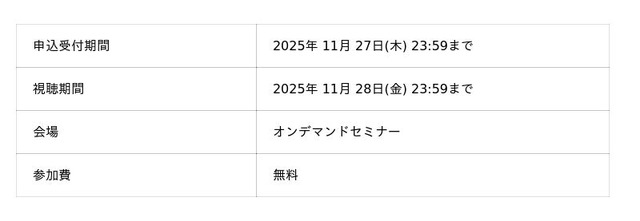 NECネクサソリューションズは、10月31日(金)まで公開しました「10分で押さえる!免税リファンド方式への変更に伴うPOS対応」セミナーの視聴期間を、ご好評につき11月28日(金)まで延長します。お申し込みは2025年11月27日(木)まで受け付けています。