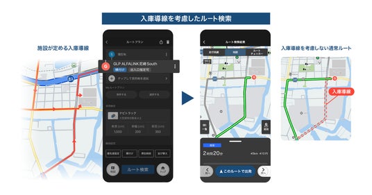 株式会社ナビタイムジャパン(代表取締役社長:大西啓介、本社:東京都港区)は、トラック専用カーナビアプリ『トラックカーナビ by NAVITIME』にて、2025年11月5日(水)より、物流施設や工場などの大型施設が定める入庫導線を考慮したルート検索を提供開始いたします。