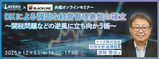 株式会社レイヤーズ・コンサルティング(東京都品川区、代表取締役CEO:杉野 尚志、以下:レイヤーズ)は、ブラックライン株式会社と共催にて、オンラインセミナー『DXによる強固な経営管理基盤の確立 ~関税問題などの逆風に立ち向かう術~』を2025年12月5日(金)に開催することを発表いたします。