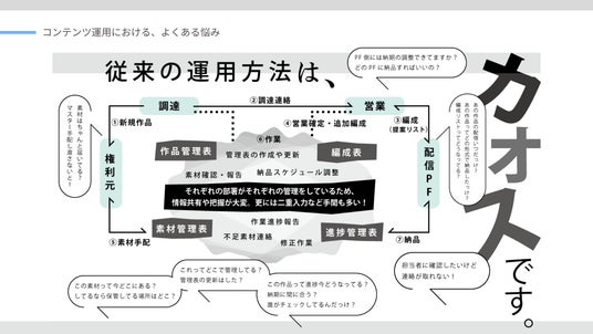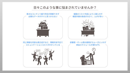 近年、企業のマーケティング活動において動画の活用は不可欠となりました。しかしその裏側で、多くの企業が爆発的に増え続けるコンテンツファイルの管理に悲鳴を上げています。私たち自身、年間6万ファイル以上の動画運用を行う中で、属人化したExcel管理によるファイルの迷子や確認作業の増大、ヒューマンエラーの頻発といった課題に直面していました。この非効率な状況は、制作サイクルの遅延や機会損失に直結する深刻な問題です。◆カオスな現場を救う、コンテンツ管理システム「Nsync」の3つの特徴