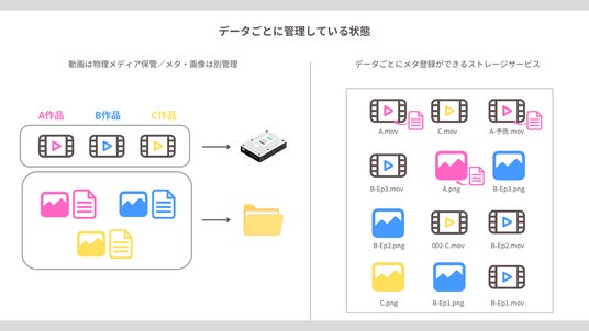 Nsyncはクラウドストレージと連携。大容量のマスターファイルも、作業を終えた配信完パケファイルも、すべてクラウドストレージへアーカイブすることで、従来ローカルPC・ファイルサーバー・Excelなどに分散していた「作品コンテンツ情報」と「ファイルの管理情報」が、クラウド上のNsyncに一元化されます。また、クラウドでアーカイブすることによって「確認のために大容量データをダウンロードする」といった待ち時間や手作業を根本からなくし、シンプルで生産性の高いワークフローを実現します。