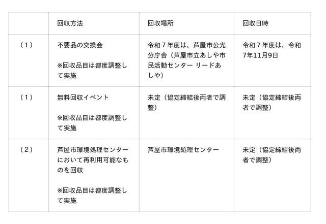 本協定により、不要品の交換会及び無料回収イベントの実施や、市の処理施設に持ち込まれたものの中から再利用可能なものの回収を行うなど、ご家庭で不要になった衣類や雑貨を廃棄するのではなく、リユースやリサイクルへと繋げる仕組みを提供することで、地域全体で資源循環に取り組みます。