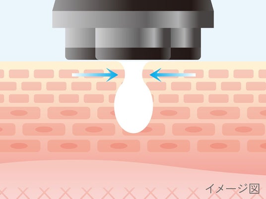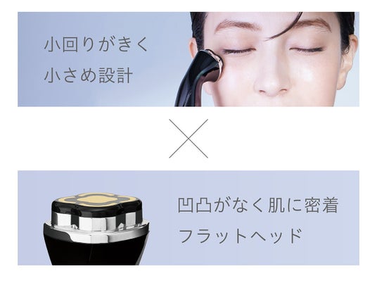 ・目元ケアに特化したヘッド形状。小回りがきく小さめ設計で、肌に直接触れるヘッド部分は凹凸のないフラットな形状を採用。