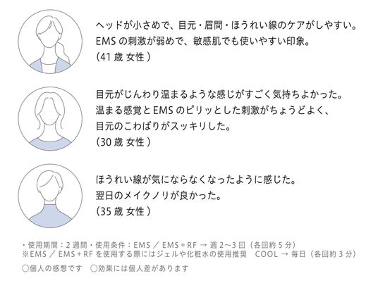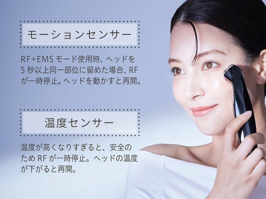 ・3つのモード搭載(RF+EMS/EMS/COOL)で目元やほうれい線など年齢とともに気になりやすいポイントにアプローチ。