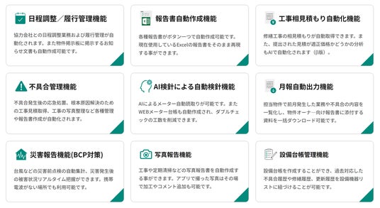 「管理ロイド」は不動産管理会社向けのAI-SaaSソフトウェアです。無料のアプリを使用して点検、検針、清掃報告などの入力を行えば、事務所への帰社後の報告書作成業務が不要になります。これにより、不動産管理実務のペーパーレス化、労働生産性の向上、遠隔確認などが実現できます。紙に起因する単純作業の削減により、労働生産性が向上するとともに、AIを活用した検針ミスの防止や履行管理の一元化により、業務リスクを軽減します。さらに、提出書類のダブルチェックなどをAIがサポートし、不動産管理の品質を向上させます。