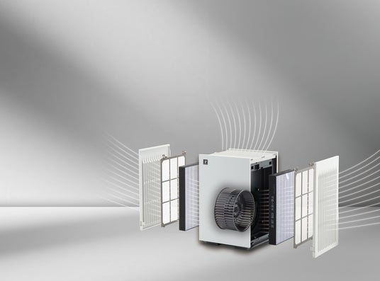 本機は、左右両側から空気を取り入れる「Wフィルター構造」を採用し、コンパクトサイズながら、広い吸い込み面積を確保。効率よく空気を送り出すことでファンの回転数を抑え、44dBの低騒音と18畳の空間まで対応するパワフルな空気清浄性能を両立しました。「自動運転」時には、ささやき声より静かな運転音(※1)を実現。音が気になる仕事部屋や寝室などの空間でも安心してご使用いただけます。また、新たに高感度ホコリセンサーを搭載し、「自動運転」時の汚れ検出の精度を高めました。