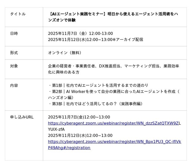 株式会社サイバーエージェント(本社:東京都渋谷区、代表取締役:藤田晋、東証プライム市場:証券コード4751)のグループ会社である株式会社AI Shift(本社:東京都渋谷区、代表取締役社長:米山結人、以下AI Shift)は、明日から業務で使える「AIエージェント」活用術を体験できる実践オンラインセミナーを開催いたします。