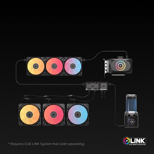 別売のiCUE LINKシステムハブと接続することで、構築済みのiCUE LINKシステムに簡単に追加可能。ケーブル不要でクリーンな配線を保ったまま対応デバイスをコントロールできます。