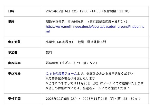 元福岡ソフトバンクホークスの吉村裕基氏をはじめとする日本野球機構(NPB)のOBを指導役にお招きし、投げる・打つ・捕るなどの基本動作から、野球の楽しみ方まで、プロならではの視点で直接ご指導いただきます。さらに、OBたちとの写真撮影タイムも予定しています。思い出に残る特別な体験をぜひお楽しみください。