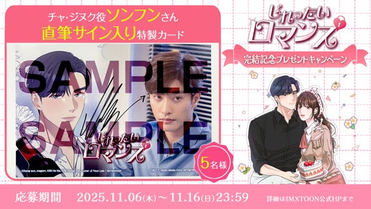 さらに、IMXTOON日本公式Xでは本日より、ドラマ「じれったいロマンス」で主演を務めたソンフンのサイン入り特製カードが当たるプレゼントキャンペーンがスタート。完結を迎えた本作を盛り上げる、特別なキャンペーンが目白押しとなっています。