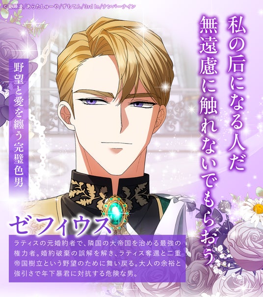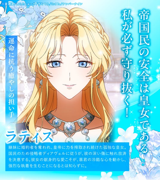 ラティスの元婚約者で、隣国の大帝国を治める最強の権力者。婚約破棄の誤解を解き、ラティス奪還と二重帝国樹立という野望のために舞い戻る。大人の余裕と強引さで年下暴君に対抗する危険な男。