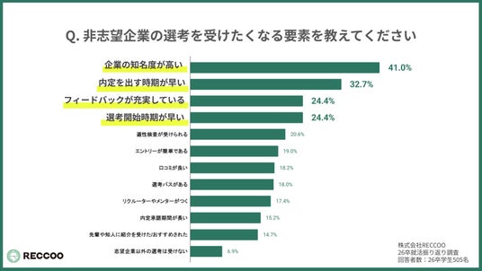 9割近い学生が非志望企業の選考を受け、そのうち約半数が「選考後に志望度が上がった」と回答。選考参加の理由は「企業の知名度」(1位)に加え、「内定を出す時期が早い」(2位)、「フィードバックが充実している」(3位)など。知名度が低い企業でも、早期選考や丁寧な対応で学生を惹きつけられる可能性が示されました。