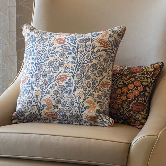 1910年前後のリバティのパターンブックをもとにしています。柔らかく仕上げられた高級リネンにプリントされたこのデザインには、スタイライズされたユリ、ベルフラワー、デイジー、カーネーションがあしらわれています。細長く絡み合う蔓(つる)は上方へと伸びるように描かれ、繊細な動きを感じさせます。自然のモチーフと緻密な形状が調和し、この時代の職人技と自然美の称賛を体現しています。