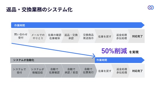 お客様自身で返品・交換の申請から返送手続きまでを完結できるようになり、メール対応や伝票作成といった手作業が不要に。