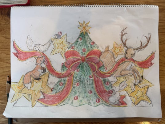 ねぶたの設計図となる重要なプロセスなため、ねぶた師が長い時間をかけて準備する制作の第一歩。クリスマスのよろこびや楽しさなどのコンセプトを元に構想を練り、鉛筆で下書きしたあとに色を付けていきます。