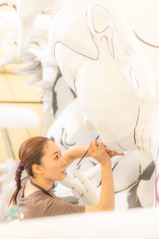 純白のねぶたに墨で、顔や手足、輪郭などを書き込んでいきます。筆の入れ方を自在に操り、迫力のある表情や優しい顔つきにもアレンジを利かせ、躍動感を吹き込みます。
