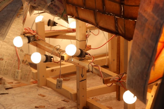 専門の配線工によって、ねぶたの内側に通常1,000個近くの照明器具が取り付けられていきます。今回のシャングリ・ラ 東京のねぶたには約200個の電球が取り付けられています。