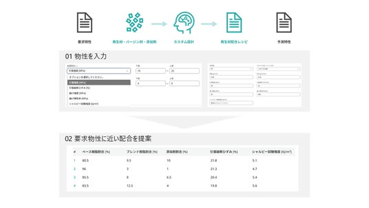 このたびの実証にあたり日立は、「再生材マーケットプレイス」において、ユーザーニーズに応じた再生材の品質分析(従来測定できなかった成形ばらつき品質、物性、規制物質など)の機能と、MIなどを用いてお客さまが求める物性を満たす再生材・バージン材・添加剤の配合比率(配合レシピ)の提案を行う機能を開発しました。本実証では、日立とトーエイがこれらの機能の有効性をともに実証し、再生プラスチックの活用における課題解決および活用拡大への貢献をめざします。