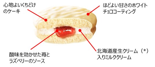- 北海道産生クリーム(*)入りのミルククリームやホワイトチョコレート、酸味を効かせた苺とラズベリーのダブルベリーソースが一体となって、ケーキを味わうようなご褒美気分になれるチョコパイです。